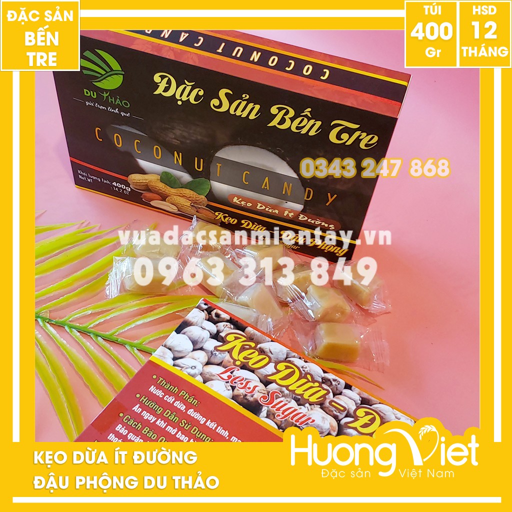 Kẹo dừa đậu phộng cao cấp Du Thảo 400g (khồng có sầu riêng) với thành phần chính của kẹo là nước cốt dừa, đậu phộng và không có sầu riêng mang đến hương vị truyền thống của kẹo dừa xứ Bến Tre
